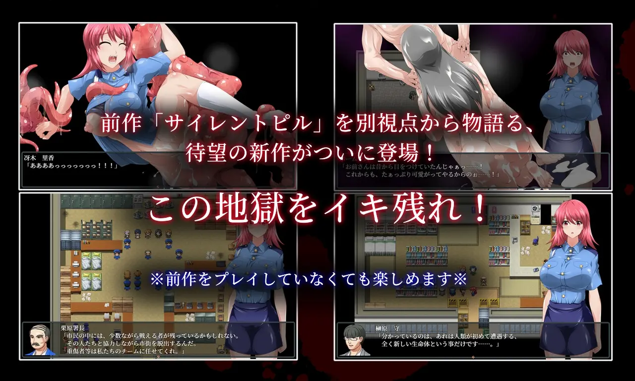 主角:冴木里香(さえきりか), 是隶属于静丘警察署的新人警察。 她作为警察守护着静丘市的和平。然而,平静的日常突然崩塌。 不明身份的生命体来袭, 男性被杀害,女性被侵犯并产下怪物的后代。 通信设备失灵,避难所的人们在恐惧中颤抖。为了向自卫队请求救援, 冴木里香将从化为地狱的静丘市中逃脱……!