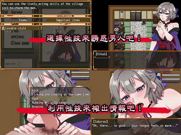 不擅長戰鬥的女忍者「桔梗」,為了完成任務,將使用自己的特長—"性技"潛入敵方陣營中。你能讓桔梗順利完成自己的使命嗎?