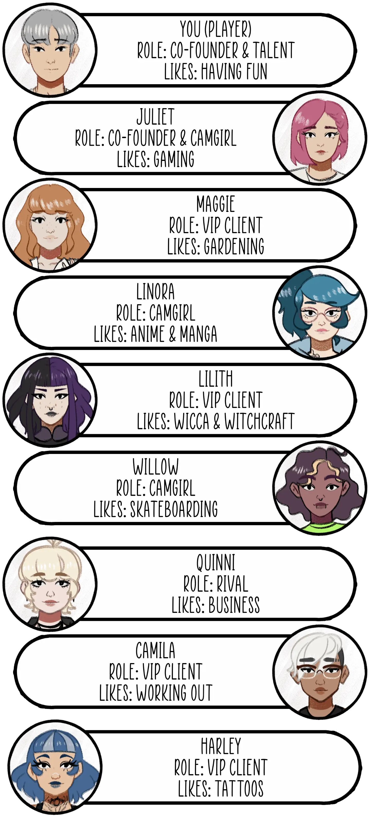 该游戏包含一个轻度策略层面——招聘人才、管理客户和处理日常决策——以及一个基于卡牌的约会小游戏,以一种轻松有趣的方式探索调情、拒绝和化学反应。